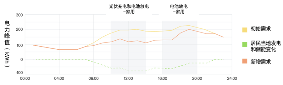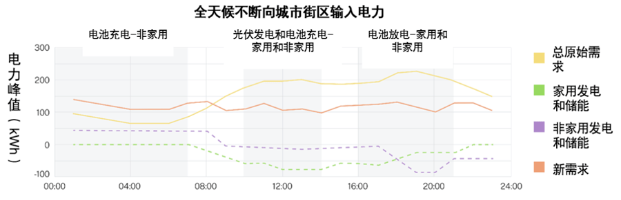 在这种情况下,街区用电总需求在下午减少到100-150千瓦,晚上保持在100到150千瓦,因为家用与非家庭用的电池都在放电,而这些电池,都在非高峰时段从电网完成了充电,将需求提高至100-150兆瓦。
