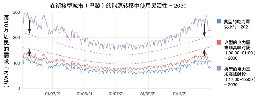 在我们的两个例子中,25-30%的供热和制冷需求及55-60%的电动汽车充电需求在高峰时段转移到一天中的其他时段,使得巴黎高峰时段的电力增长从140-190%下降到110-140%,布宜诺斯艾利斯高峰时段的电力增长从130-300%下降到114-230%。