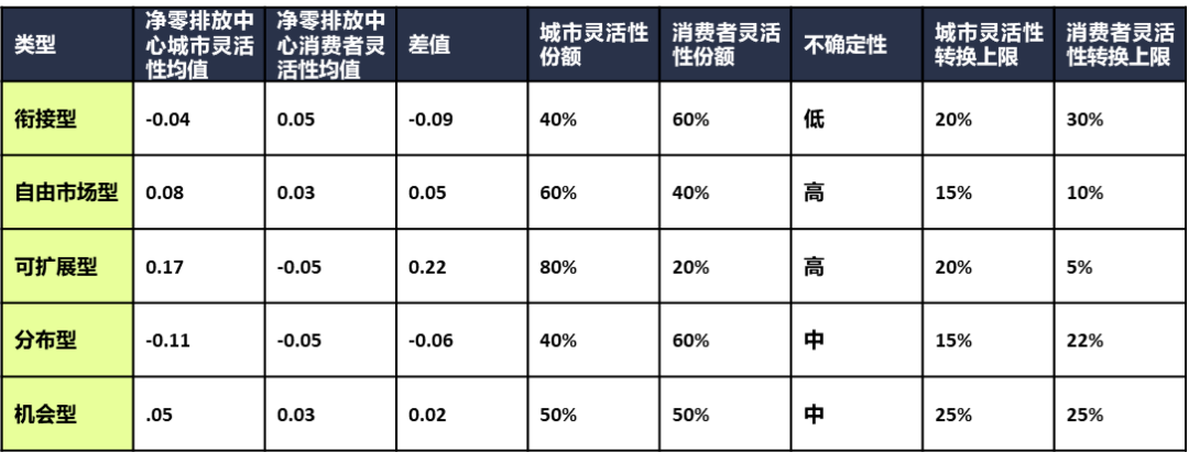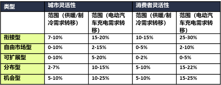 我们评估了五种类型在高峰时段电力需求的灵活性。首先从每个类型的城市及消费者灵活性标准指标的平均值开始。根据指标之间的差异,对灵活性在城市及消费者灵活性中所占的份额进行分配。我们估计了低、中、高不确定性,以了解灵活性的范围。基于对不同类型的优势分析,我们评估了不同类型场景的灵活性上限,并将其划分为城市灵活性和消费者灵活性。