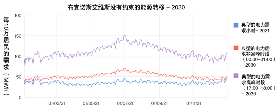 借助已建立的指标,我们为每个城市类型制定了预测,以显示如何摆脱需求峰值。通过重新分配能源消耗,能够减少一天中碳密集的时段,创造了零排放,甚至正能量的时段。如前文所述,我们预测到2030年一座不受约束的城市的能源转型将会是什么样子——可能是峰值电力需求的三倍。