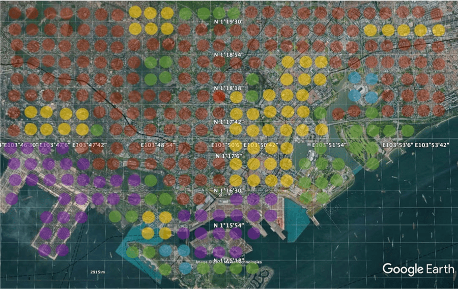 第一个指标是衡量一个城市中心周围125平方公里范围内土地使用的集中度,使用市场集中度的Herfindahl-Hirschman(HHI)指数来估计城市一个典型地区的电力需求组合(国内/非国内)。下面,我们可以看到新加坡的一个例子。