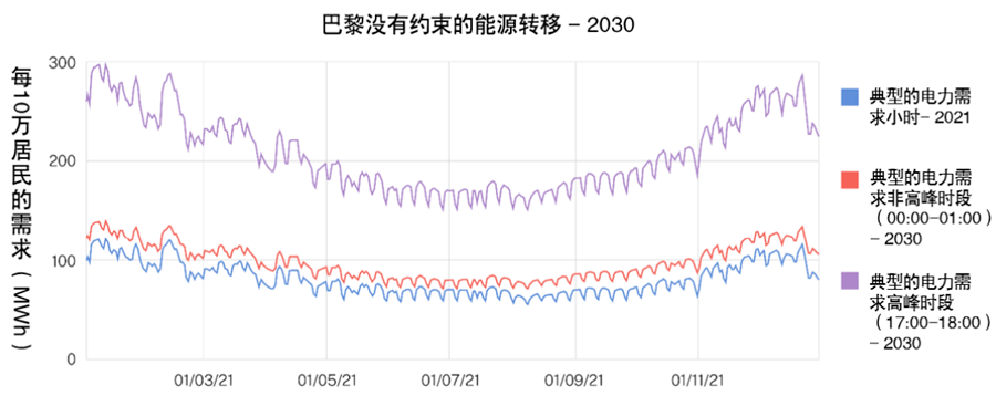 净零排放中心的分析表明,如果热能和交通的脱碳化以一个没有限制的方式进行,那么电力峰值需求可以在2030年轻易的增加三倍。我们在两个不一样的城市中进行了测试,在巴黎和布宜诺斯艾利斯使用了不同的电动汽车和热泵的吸收情况。在巴黎,根据气候的不同,高峰期典型的用电需求大约为每10万居民70-100千瓦;在布宜诺斯艾利斯,每10万居民的用电需求是40-50千瓦。在这两种情况下,和目前水平相比冬季的电力峰值需求将会增加三倍,夏季将会增加两倍。如果按照今天自上而下相同的发电管理方式来处理这个问题, 那么经济发展会因为必要的电网强化工程而被放缓,居民和企业将会通过能源账单或一般税收来承担费用。