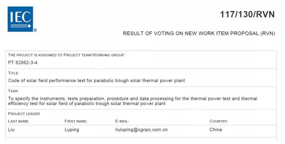 近日,国家太阳能光热联盟理事单位—中国广核新能源控股有限公司(简称“中广核新能源”)主导申报的《槽式太阳能光热发电站集热系统性能测试规程》国际标准通过国际电工委员会(IEC)投票,成功立项。