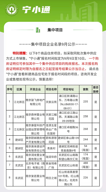 买房人做好报名预备!南京第二批会集供给热盘定了,总共8家楼盘,今日(9月8日)会集领证,明日开端报名。