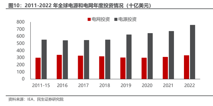 新能源电力不稳定导致峰谷差加剧,影响电网稳定性。由于分布式风电、光伏等电源的出力不稳定性,其大规模接入给配电系统带来更多不确定性、随机性,而同时由于现有电网系统不能很好的调节发电端和负荷端的平衡供需,导致弃光、弃风现象频出。随着太阳能光伏和风能等可变可再次生产的能源份额的增加,对电力系统的灵活性提出了更大的挑战。新能源的大量并入电网,对电网造成挑战,倒逼电网也需要匹配同样力度的投资建设。从全球角度来看,2022 年电力装机容量投资相较于 17 年大幅度增长近 40%,已超过 7500 亿美元。相比之下,电网基础设施投资保持相对来说比较稳定,每年稳定在 3000 亿美元左右。我们预计在能源转型趋势的推动下,全球电网投资有望匹配上升,以满足日渐增长的新能源需求。