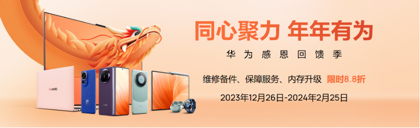 华为感恩回馈季活动(至2024年2月25日结束)也正在火热进行中,用户前往华为服务店,还能享受部分产品维修备件8.8折、内存升级服务8.8折、指定保障服务8.8折优惠,不仅省心也更省钱。